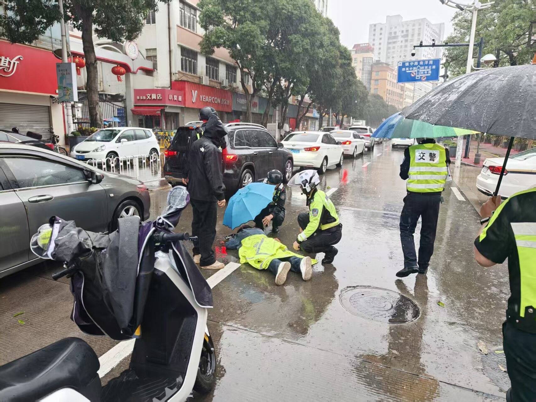 铁骑队员雨中护送伤者紧急就医